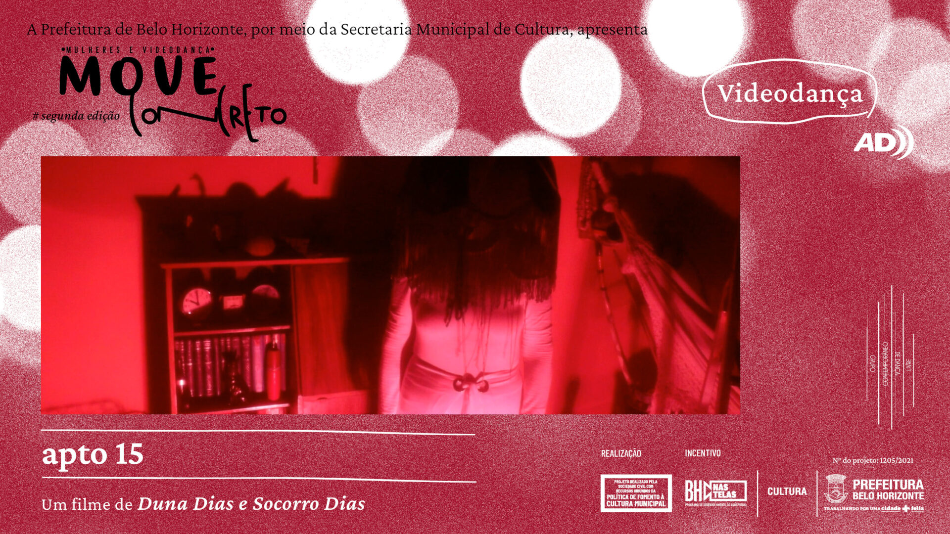 Sinopse: “apto 15” foi realizado na residência das artistas Duna Dias e Socorro Dias através de experimentações envolvendo movimentações de câmera – incluindo planos sequência- o uso de filtros analógicos, desenvolvimento da fotografia com iluminação caseira e o flerte com a linguagem fantástica, do suspense e do terror. As artistas também trazem algumas referências cinematográficas – indo de Maya Deren a “Corra Lola, Corra” – trazendo para o campo da videodança uma atmosfera fantástica/onírica/surreal dentro de um ambiente doméstico e cotidiano. É uma obra que surge da residência artística “Apartamento 15” realizada desde o início da pandemia (em março de 2020) com o desejo de transformar o convívio das duas artistas – que também são mãe e filha – em potência criativa.